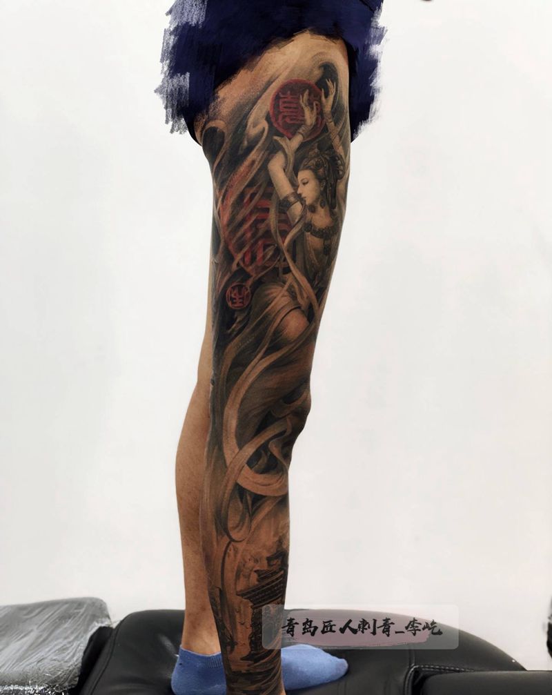 八部天龙纹身图片_腿部新传统欧美写实八部天龙飞天修罗纹身图案