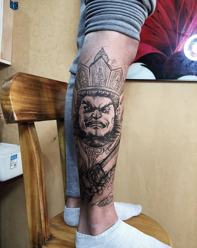 当前位置: 首页 >山东省青岛市纹身店-匠人刺青纹身图案>四大天王纹身图片_腿部成品传统写实人物鬼神原创纹身图案