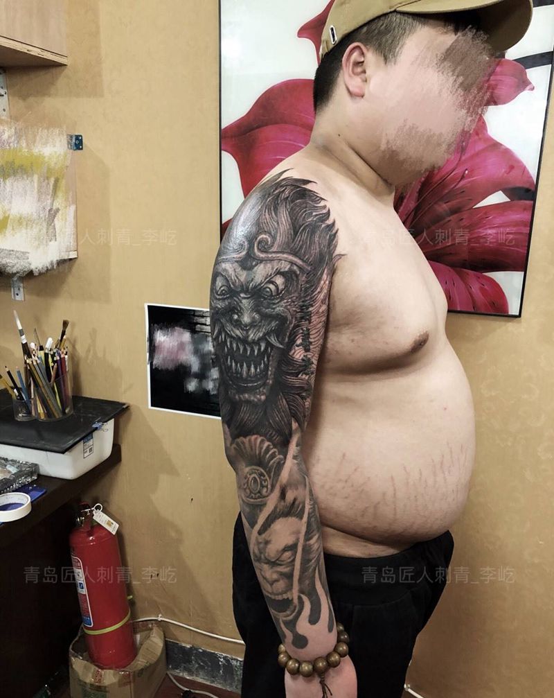 当前位置: 首页 >山东省青岛市纹身店-匠人刺青纹身图案>大臂遮盖 猴子纹身图片_成品肩部手臂传统写实人物纹身图案