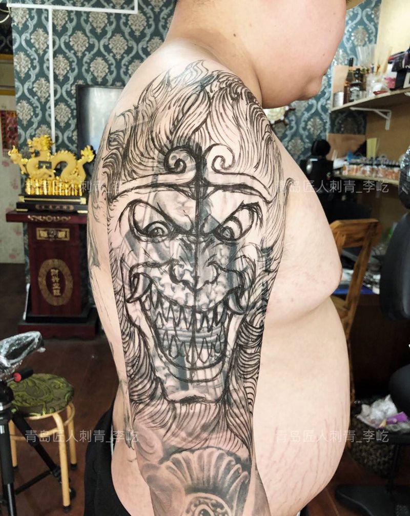 当前位置: 首页 >山东省青岛市纹身店-匠人刺青纹身图案>大臂遮盖 猴子纹身图片_成品肩部手臂传统写实人物纹身图案