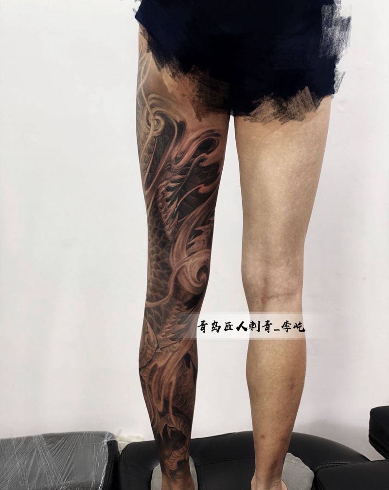 • T网红王老大花腿龙纹身图片_腿部新传统纹身图案