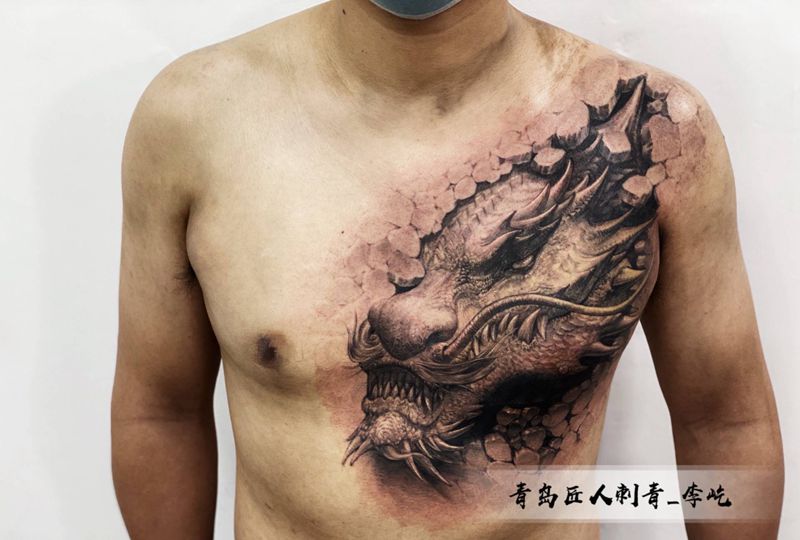 当前位置: 首页 >山东省青岛市纹身店-匠人刺青纹身图案>胸口 龙头纹身图片_胸部新传统欧美写实龙纹身图案
