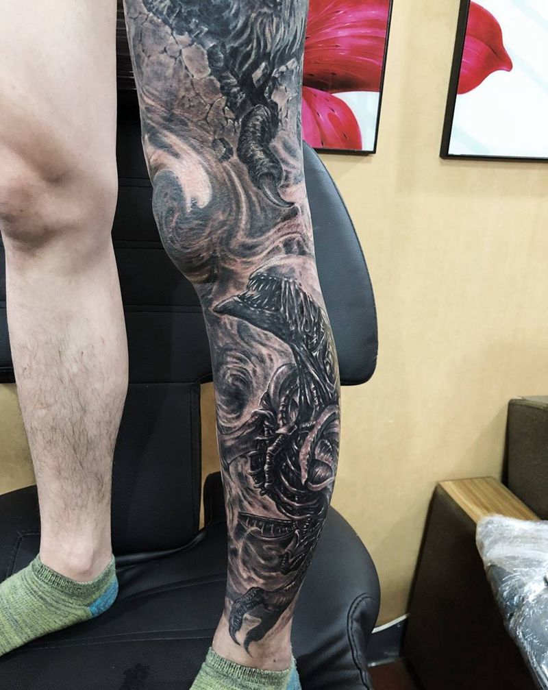• T网红王老大花腿龙纹身图片_腿部新传统纹身图案