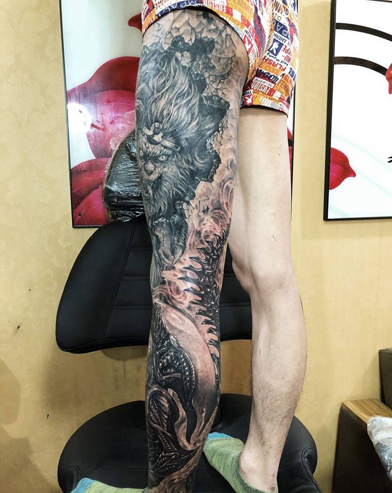 • T网红王老大花腿龙纹身图片_腿部新传统纹身图案