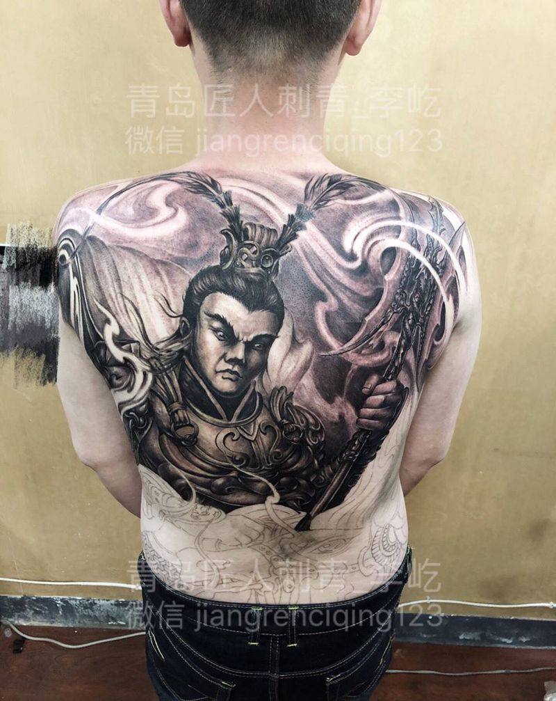 临摹 吕布 满背纹身图片_成品背部传统写实人物纹身图案