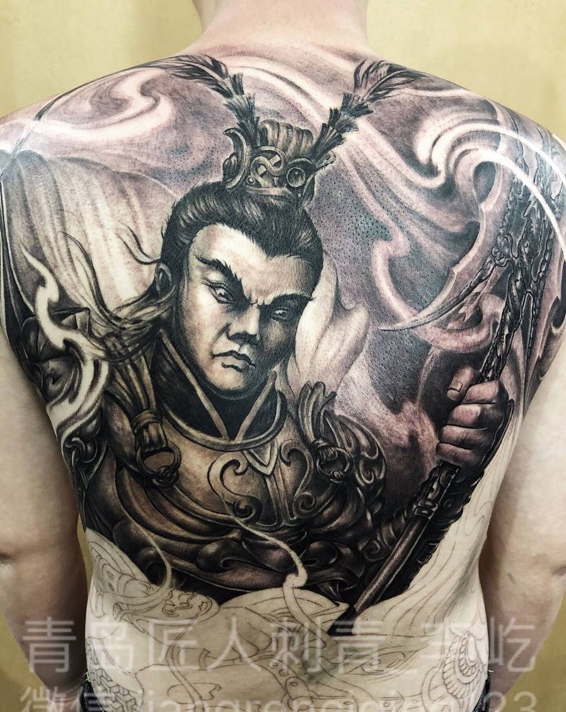 临摹 吕布 满背纹身图片_成品背部传统写实人物纹身图案