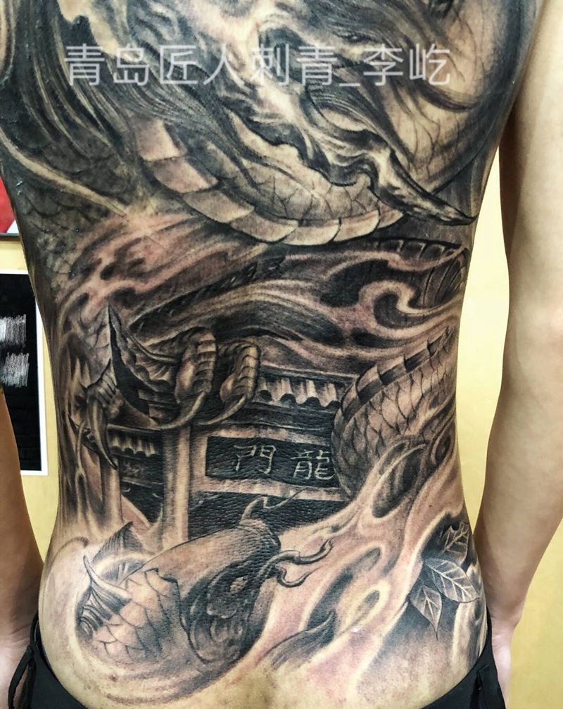 当前位置: 首页 >山东省青岛市纹身店-匠人刺青纹身图案>龙门 满背纹身图片_成品背部传统习俗写实鬼神原创纹身图案