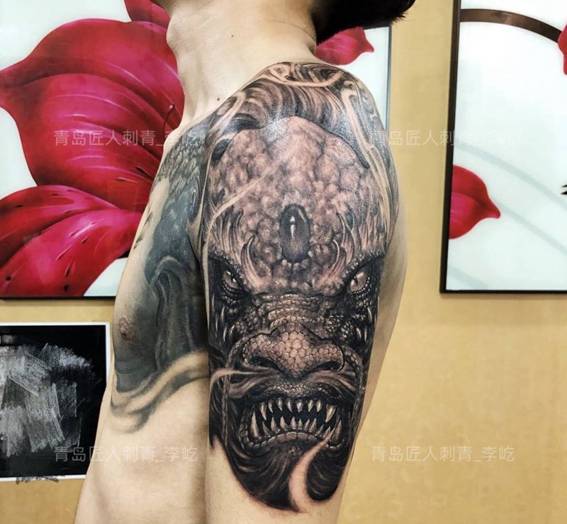 佛 龙 半甲纹身图片_成品肩部胸部手臂传统写实人物动物鬼神原创纹身图案