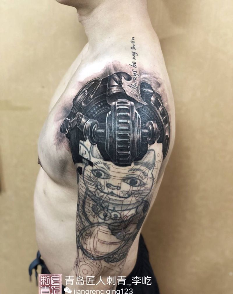 遮盖未完成机械臂纹身图片_成品手臂欧美写实原创纹身图案