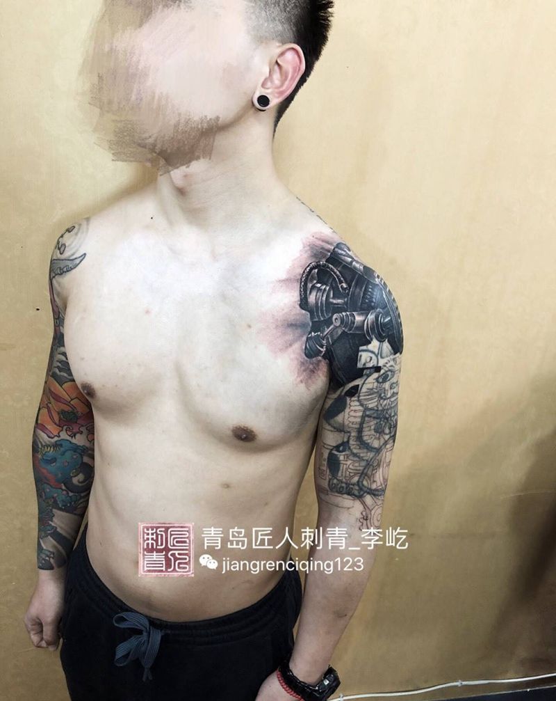 遮盖未完成机械臂纹身图片_成品手臂欧美写实原创纹身图案