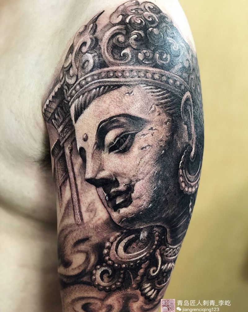 石雕菩萨纹身图片_成品手臂传统写实人物原创纹身图案