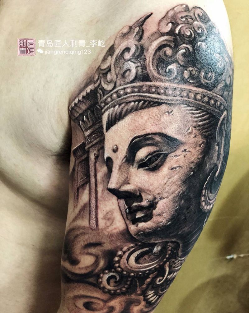 石雕菩萨纹身图片_成品手臂传统写实人物原创纹身图案