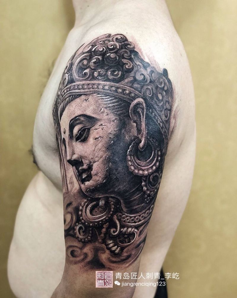 石雕菩萨纹身图片_成品手臂传统写实人物原创纹身图案