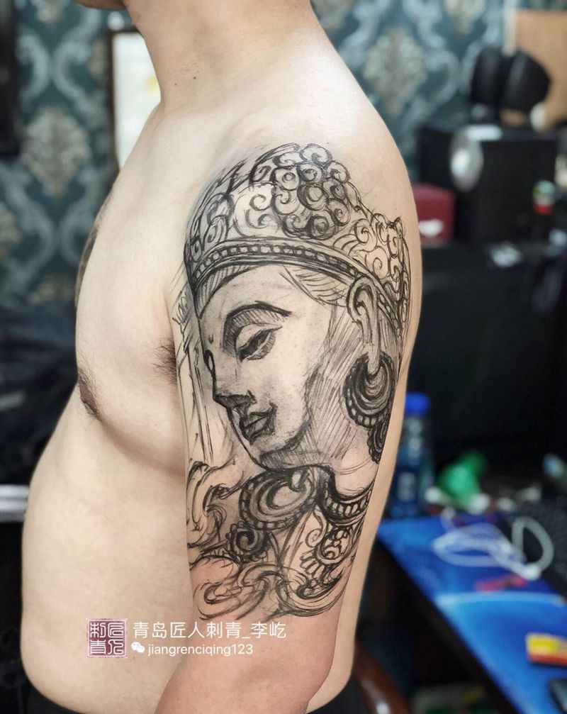 石雕菩萨纹身图片_成品手臂传统写实人物原创纹身图案