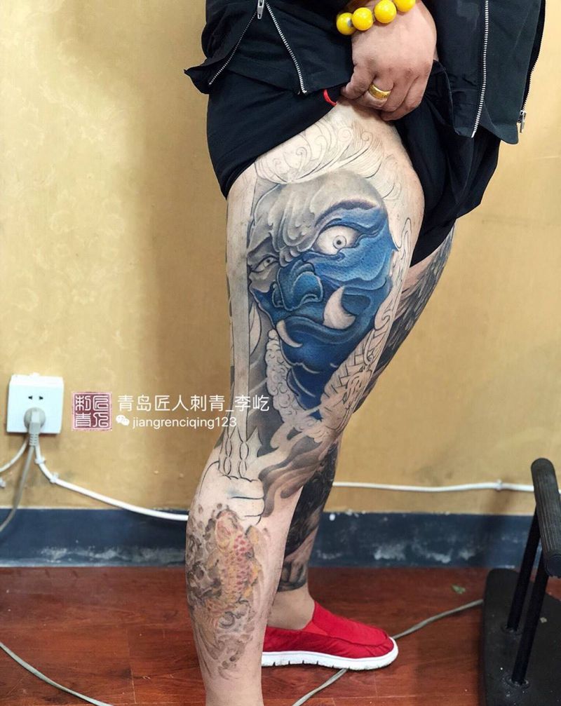 当前位置: 首页 >山东省青岛市纹身店-匠人刺青纹身图案>不动明王 彩色花腿纹身图片_成品腿部传统肖像人物鬼神原创纹身图案