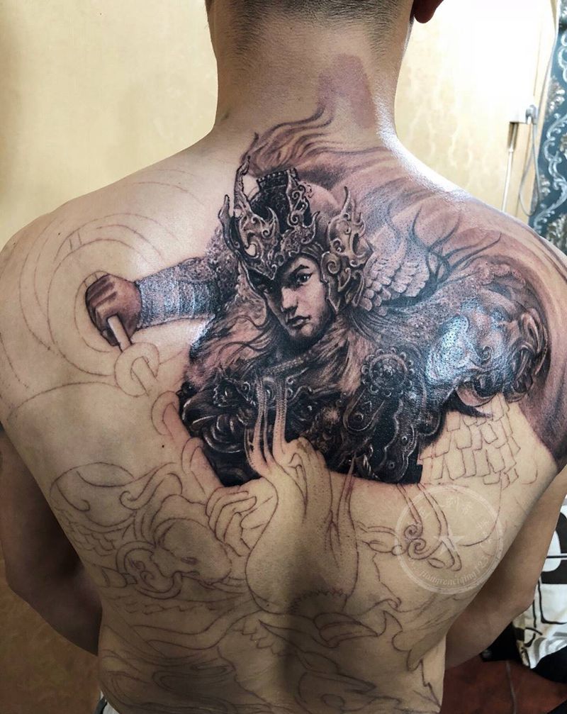 赵云龙临满背纹身图片_成品背部传统写实人物纹身图案