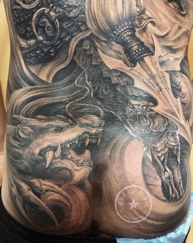 赵云 龙临 满背纹身图片_成品背部传统写实人物纹身图案