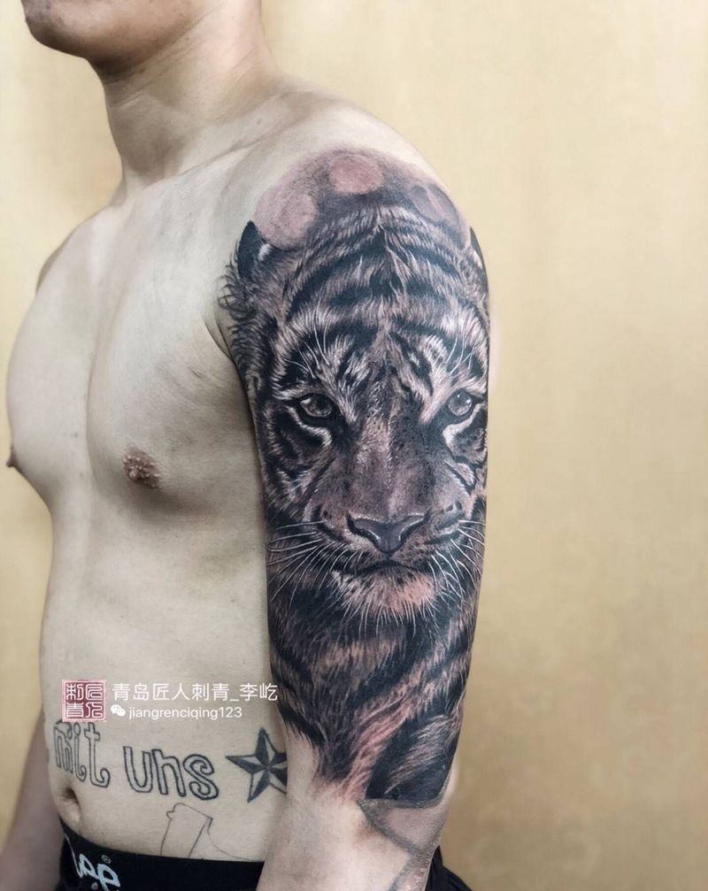 当前位置: 首页 >山东省青岛市纹身店-匠人刺青纹身图案>老虎纹身 老虎花臂纹身图片_成品手臂欧美写实动物原创纹身图案
