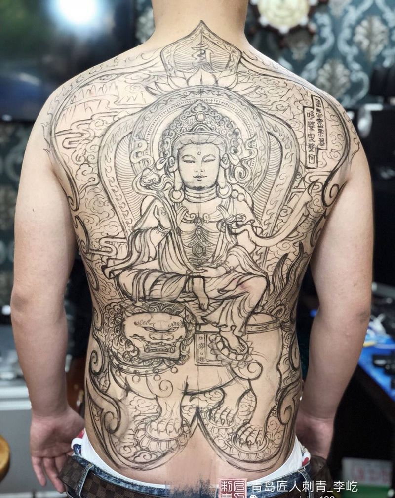 临摹石窟文殊纹身图片_成品背部传统写实人物鬼神纹身图案
