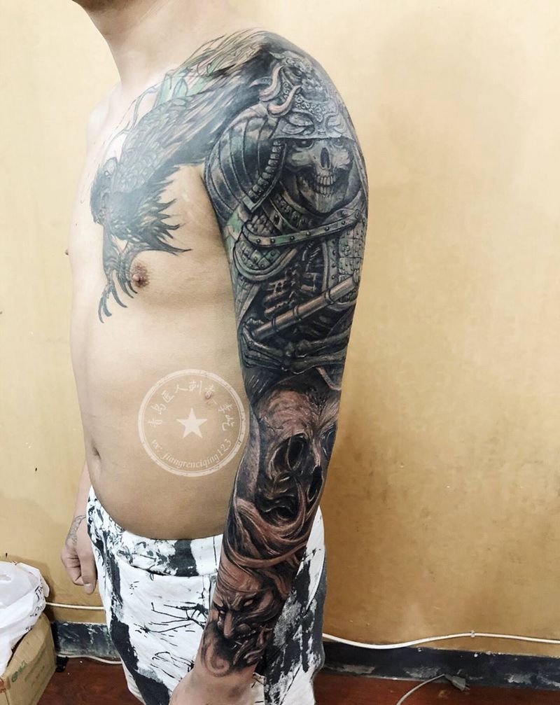 遮盖过肩龙 鬼武士花臂 骷髅花臂纹身图片_成品胸部手臂传统写实人物鬼神原创纹身图案