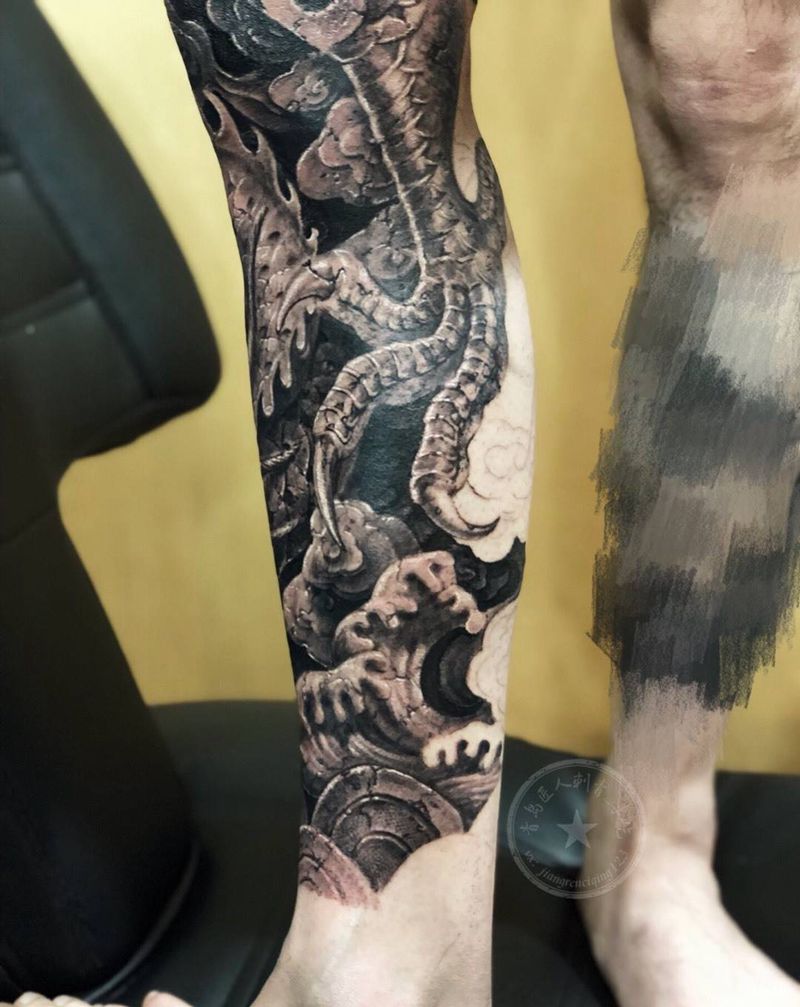 石雕龙腿 花腿 小腿部分近景纹身图片_成品腿部传统写实动物原创纹身图案