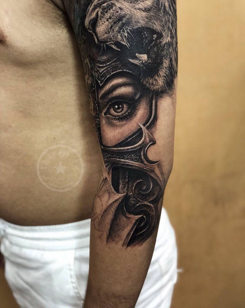 欧美花臂 七分袖 狮子纹身纹身图片_成品手臂欧美写实人物动物原创纹身图案