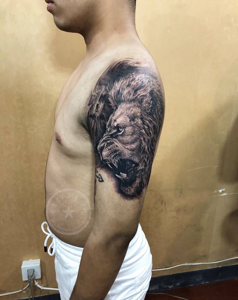 当前位置: 首页 >山东省青岛市纹身店-匠人刺青纹身图案>狮子写实半臂 大臂纹身图片_成品手臂写实动物原创纹身图案