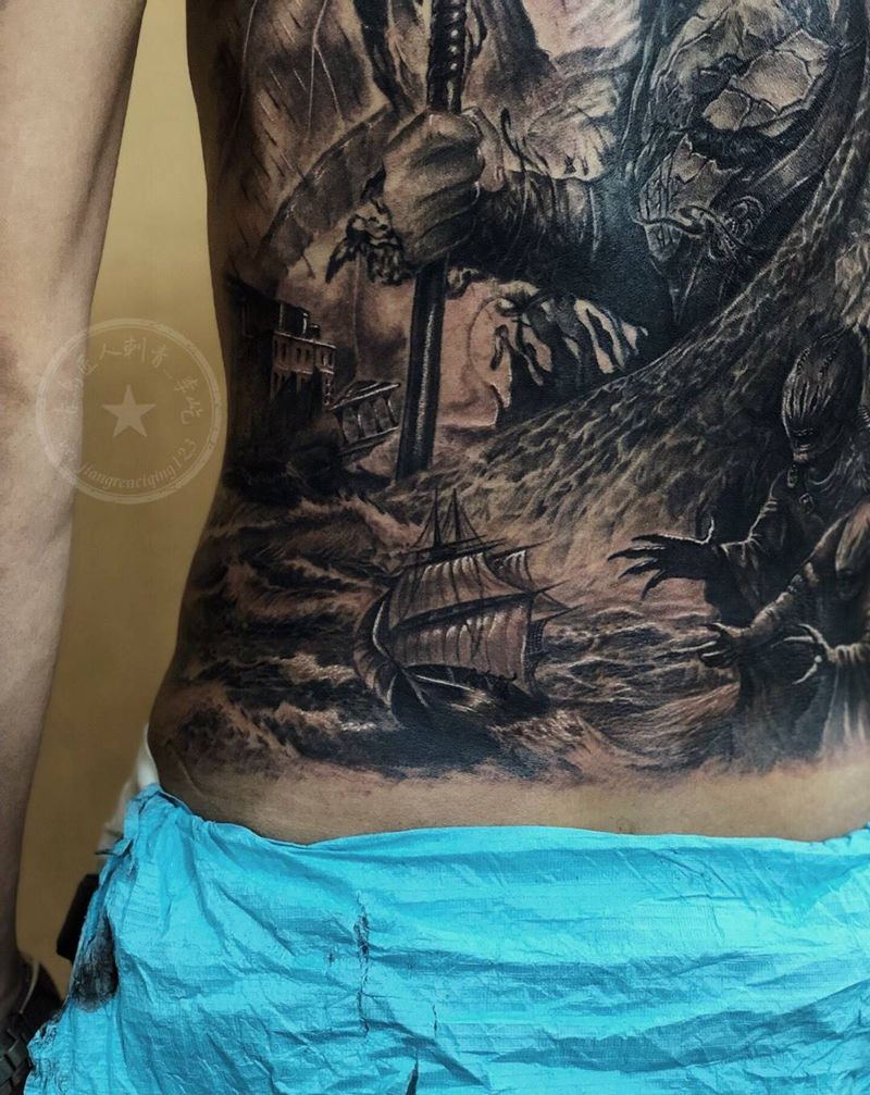 当前位置: 首页 >山东省青岛市纹身店-匠人刺青纹身图案>暴力遮盖 满背 诸神之战纹身图片_背部欧美写实哈迪斯宙斯纹身图案