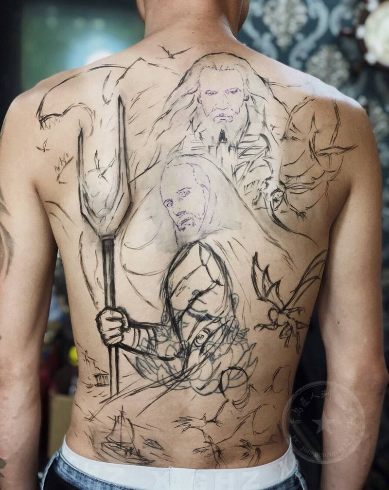 暴力遮盖 满背 诸神之战纹身图片_背部欧美写实哈迪斯宙斯纹身图案
