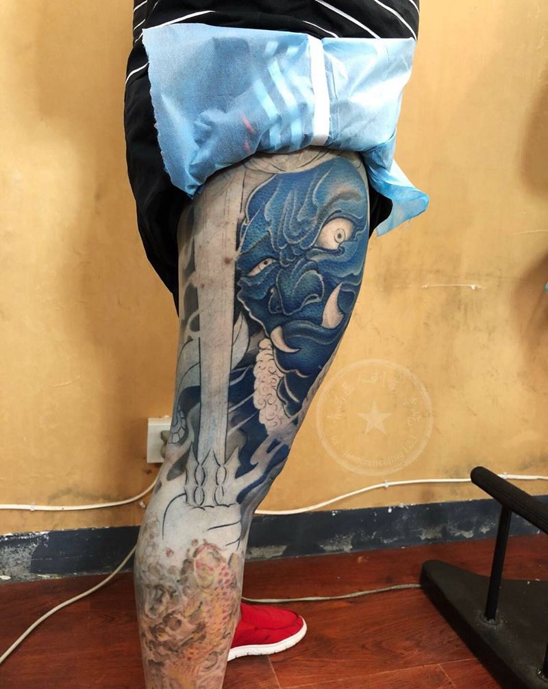 当前位置: 首页 >山东省青岛市纹身店-匠人刺青纹身图案>不动明王花腿纹身图片_成品腿部传统人物纹身图案