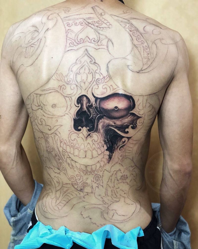 嘎巴拉满背 写实版纹身图片_背部欧美写实嘎巴拉纹身图案