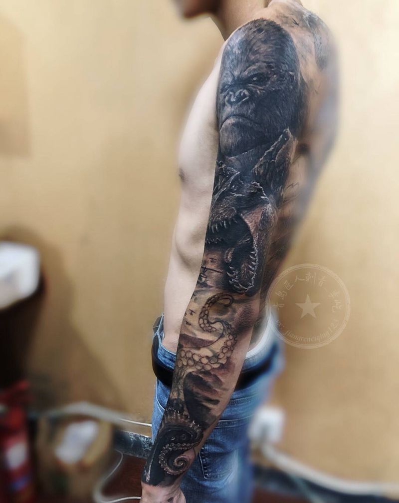 花臂遮盖未完成 金刚纹身图片_手臂欧美写实金刚恐龙纹身图案