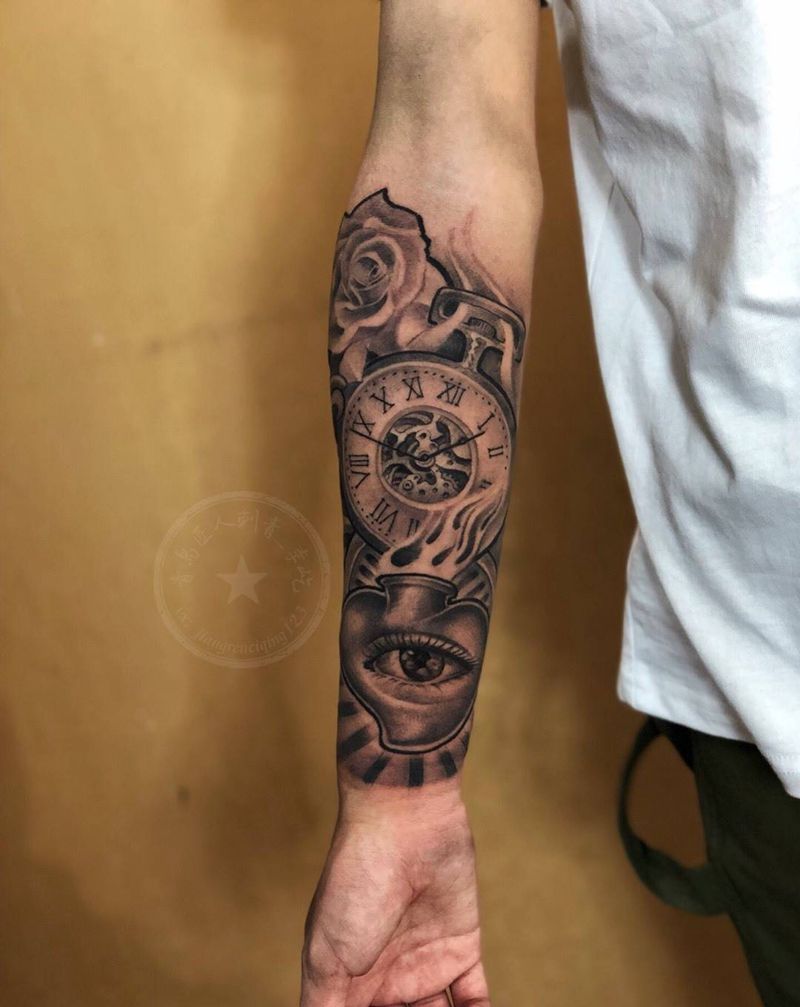 当前位置: 首页 >山东省青岛市纹身店-匠人刺青纹身图案>欧美小臂纹身图片_手臂欧美写实钟表d花眼睛纹身图案