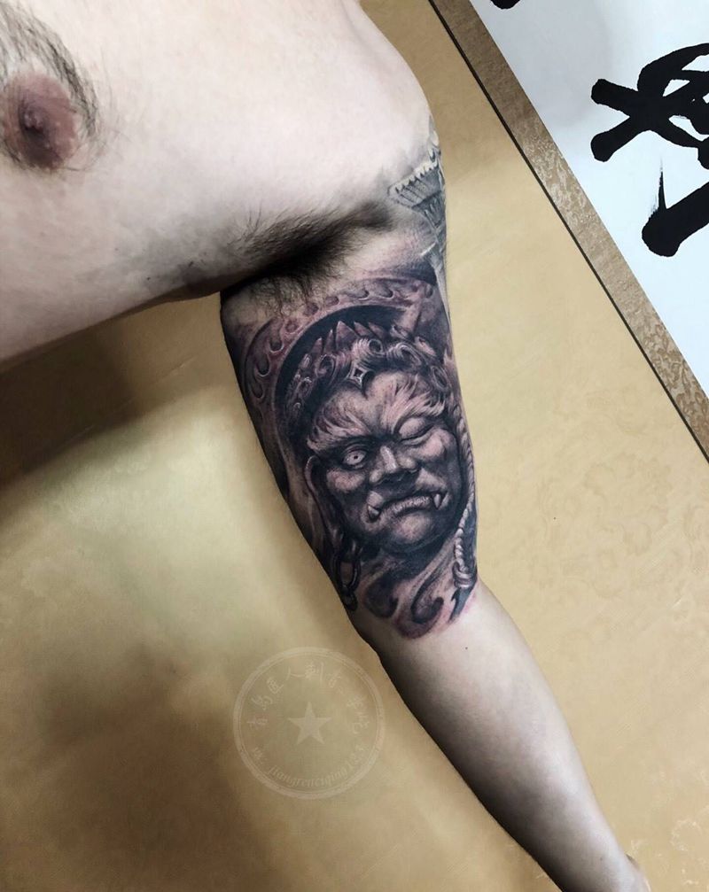 当前位置: 首页 >山东省青岛市纹身店-匠人刺青纹身图案>不动明王纹身图片_手臂欧美写实新传统不动明王纹身图案
