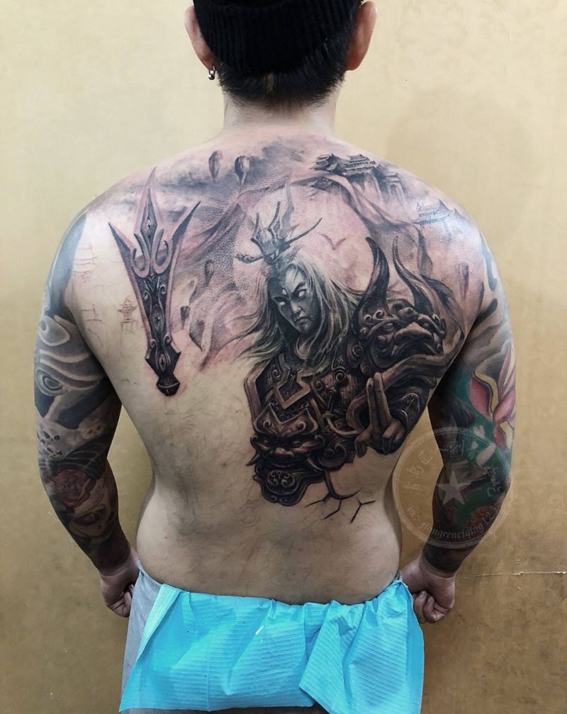 二郎神 杨戬 满背纹身图片_背部新传统欧美写实二郎神杨戬纹身图案
