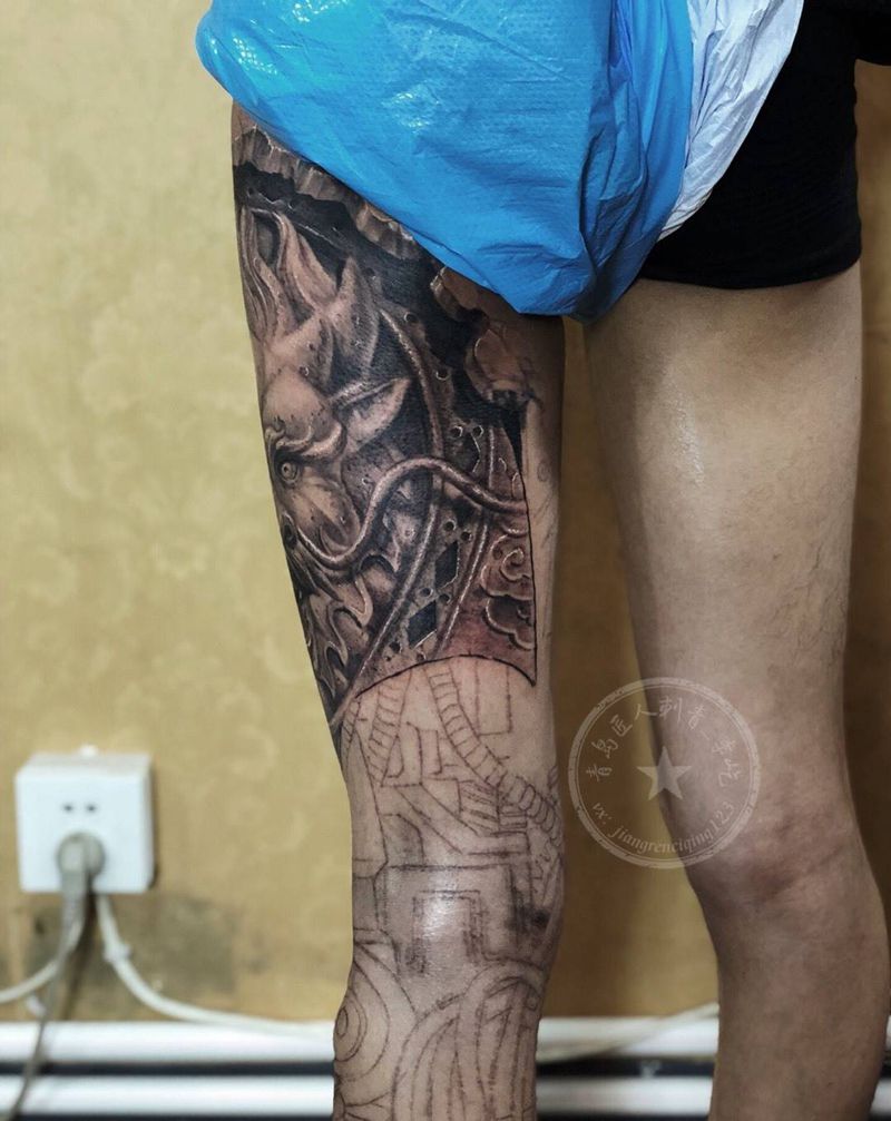 当前位置: 首页 >山东省青岛市纹身店-匠人刺青纹身图案>机械雕龙腿纹身图片_腿部欧美写实新传统石雕机械纹身图案