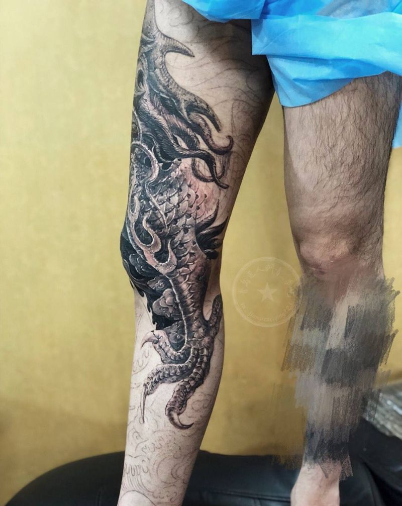 当前位置: 首页 >山东省青岛市纹身店-匠人刺青纹身图案>石雕龙腿 花腿纹身图片_成品腿部传统写实动物原创纹身图案
