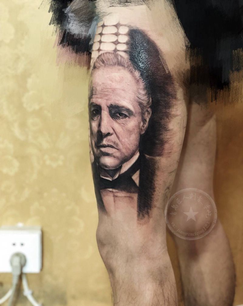教父肖像 花腿 包腿纹身图片_腿部欧美写实教父纹身图案
