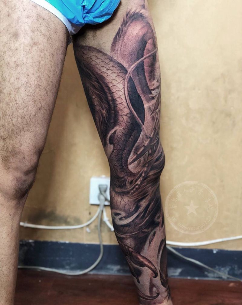 • T网红王老大花腿龙纹身图片_腿部新传统纹身图案
