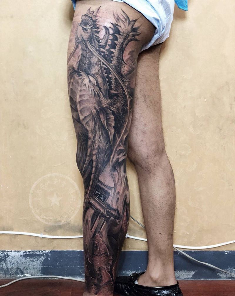 当前位置: 首页 >山东省青岛市纹身店-匠人刺青纹身图案>龙花腿 鲤鱼跃龙门2 龙门2纹身图片_腿部新传统龙 龙门鲤鱼纹身图案