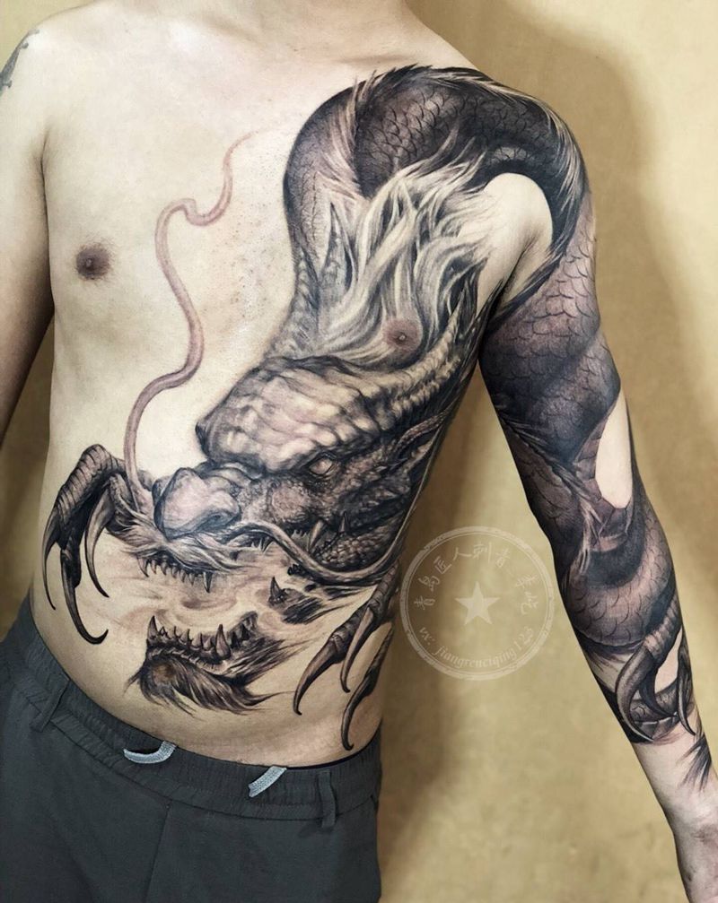 • T网红王老大花腿龙纹身图片_腿部新传统纹身图案
