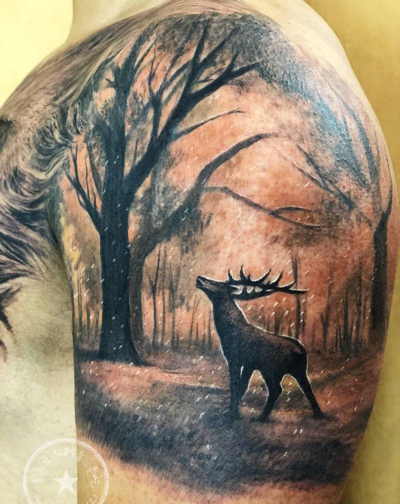 狮子半甲纹身图片_胸部肩部新传统欧美写实狮子鹿纹身图案