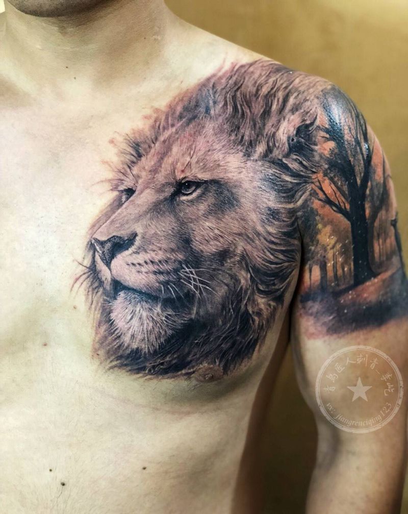 当前位置: 首页 >山东省青岛市纹身店-匠人刺青纹身图案>狮子半甲纹身图片_胸部肩部新传统欧美写实狮子鹿纹身图案