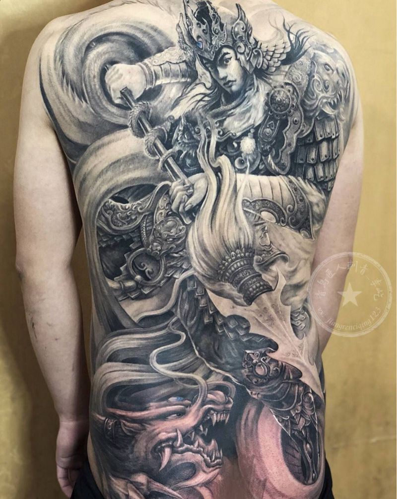 临摹 龙临 赵云纹身图片_背部新传统欧美写实赵云纹身图案