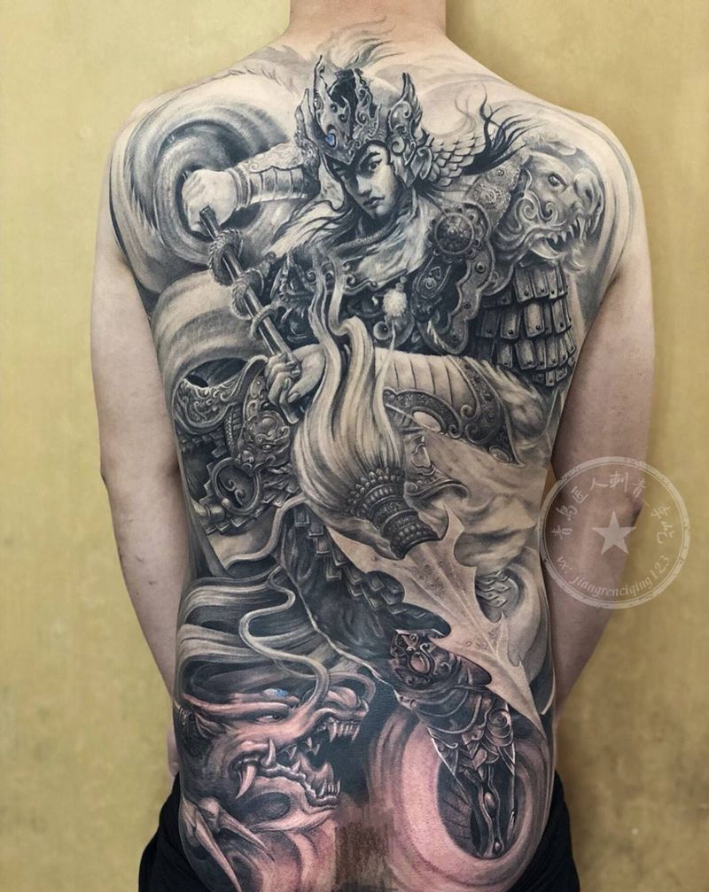 临摹 龙临 赵云纹身图片_背部新传统欧美写实赵云纹身图案