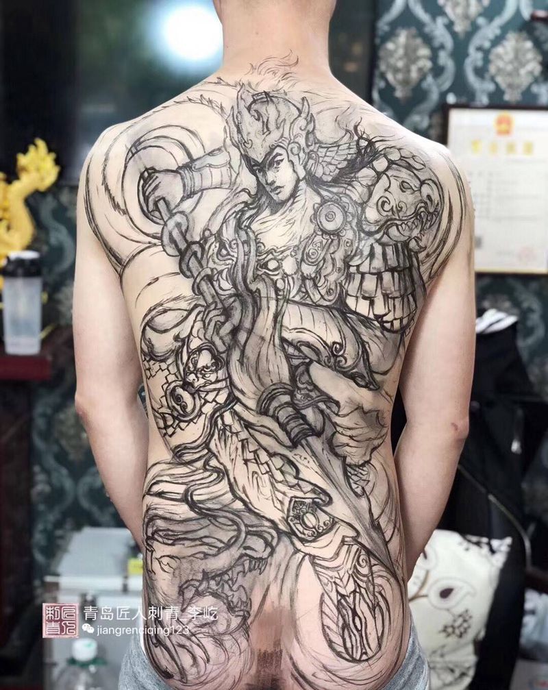 临摹 龙临 赵云纹身图片_背部新传统欧美写实赵云纹身图案