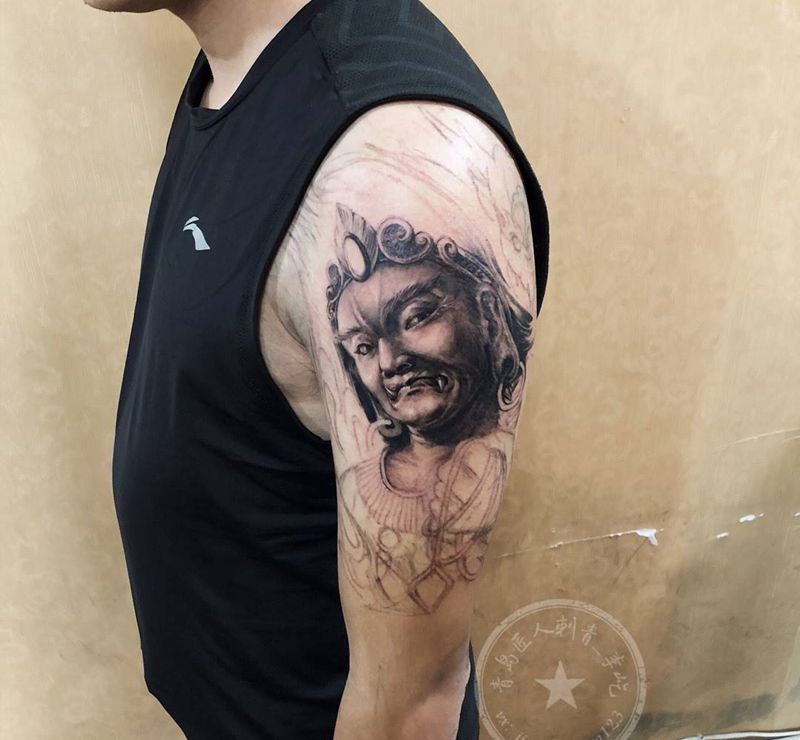 不动明王纹身图片_肩部新传统不动明王肖像纹身图案