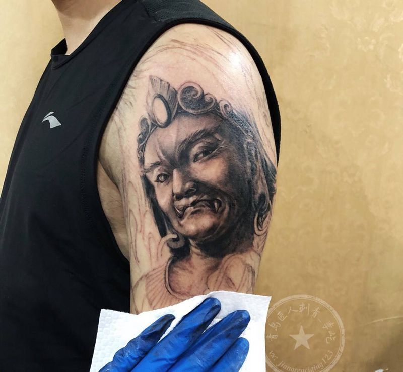 不动明王纹身图片_肩部新传统不动明王肖像纹身图案