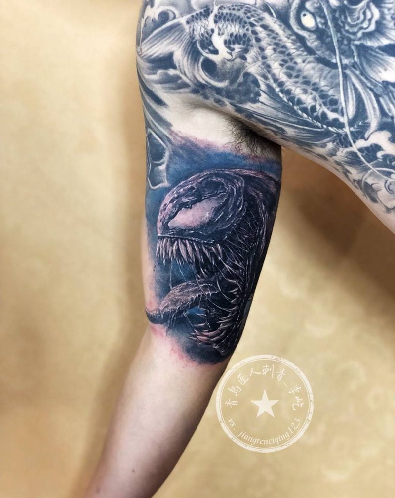 当前位置: 首页 >山东省青岛市纹身店-匠人刺青纹身图案>毒液纹身图片_手臂新传统欧美写实漫威毒液纹身图案