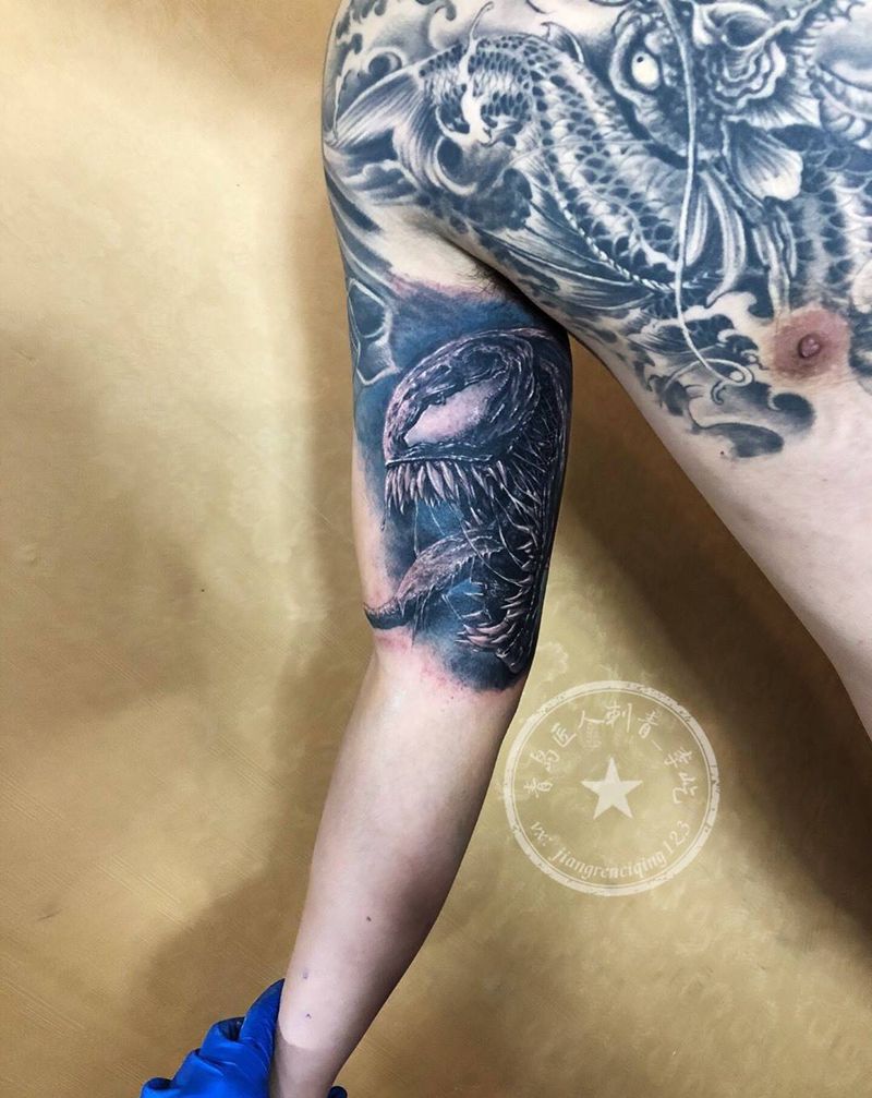 毒液纹身图片_手臂新传统欧美写实漫威毒液纹身图案